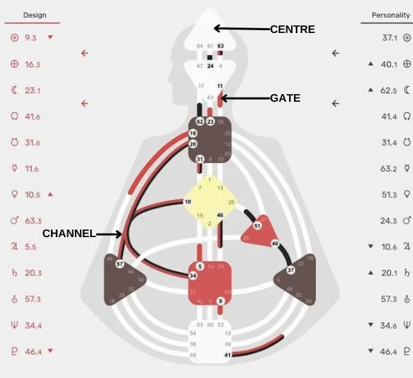 Within the 9 centres you will find numbers, there are 64 numbers in total that make up the entire BodyGraph. The 64 gates are reminiscent of the 64 hexagrams of the Chinese I Ching and they correlate to the 64 codons that make up our DNA. Each gate also carries with it individual characteristics, traits and nuances.